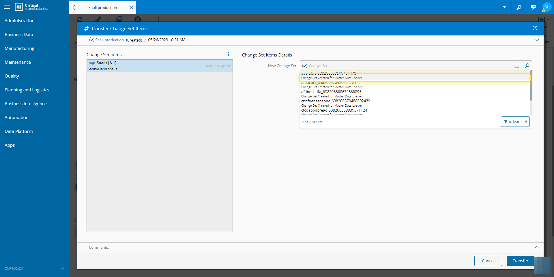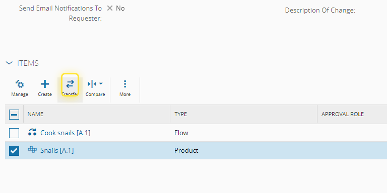 6. Select the Change Set where the Item is to be transferred to.#