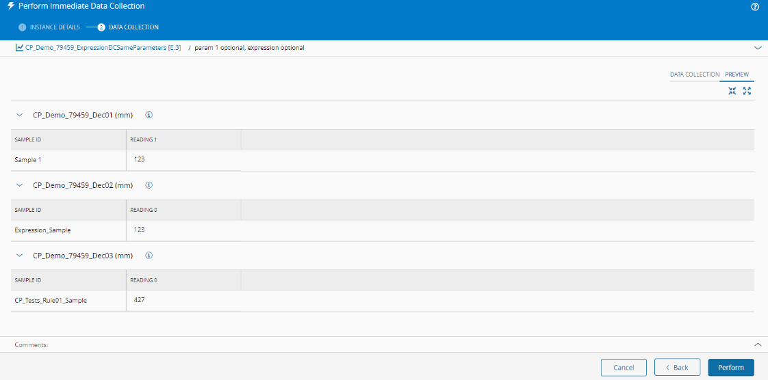 The Perform and Correct Data Collection wizards were not modified. Similar to parameters with a calculation of type Rule, Expression parameters are not displayed in the Data Collection step of the Post, Perform Immediate, and Correct wizards, because they are calculated by the system. However, as already happens with the Rule calculation mode, Expression parameters are evaluated for preview when you select the Preview tab: