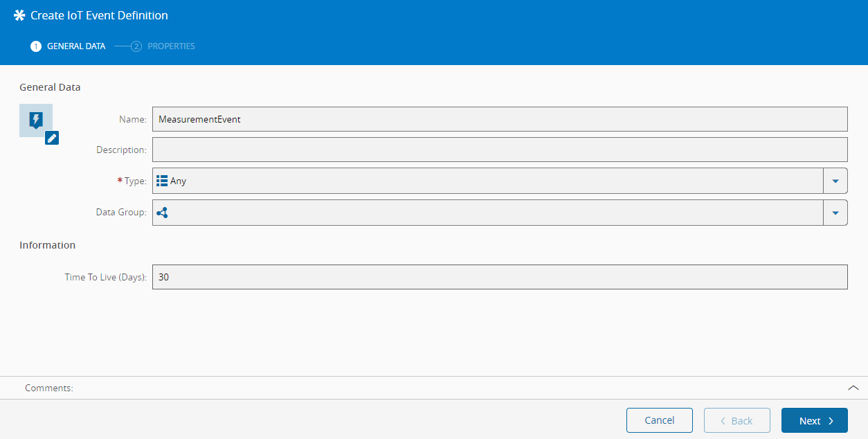 在主菜单的“业务数据”部分,导航至物联网定义磁贴并创建新条目。为物联网事件定义提供一个名称。请记住,该名称将标识整个数据平台基础设施中的事件,因此它应该是一个有意义的名称,供以后参考。以下是这些值的示例: