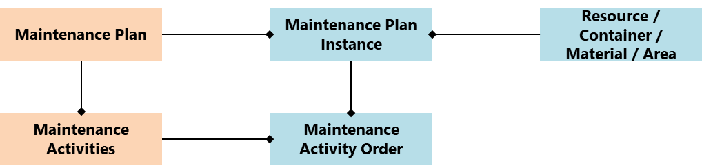 维保管理以包含多项维保活动的维保计划为中心。可以将相同的维保计划分配给不同的对象,从而创建维保计划实例。维保计划实例包含维保活动工单。只要维保计划不重复,对象就可以有多个维保计划实例。下图显示了一个简化的对象模型。