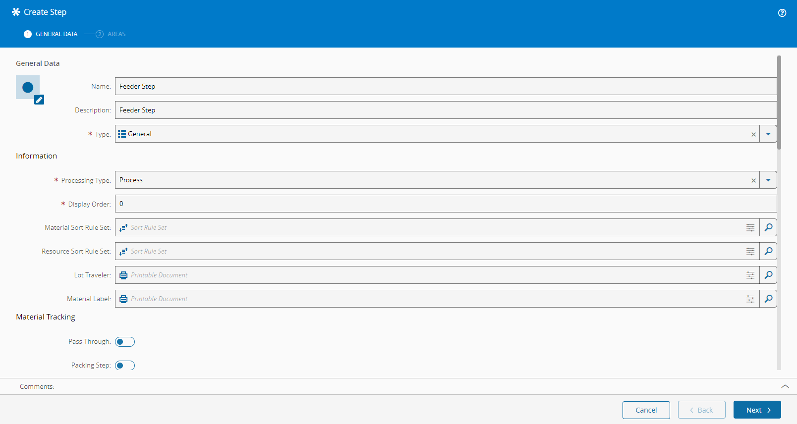 1. Create a Step of Processing Type Process. Use Grams as the Primary Units, and Cookie Manufacturing for the Area: