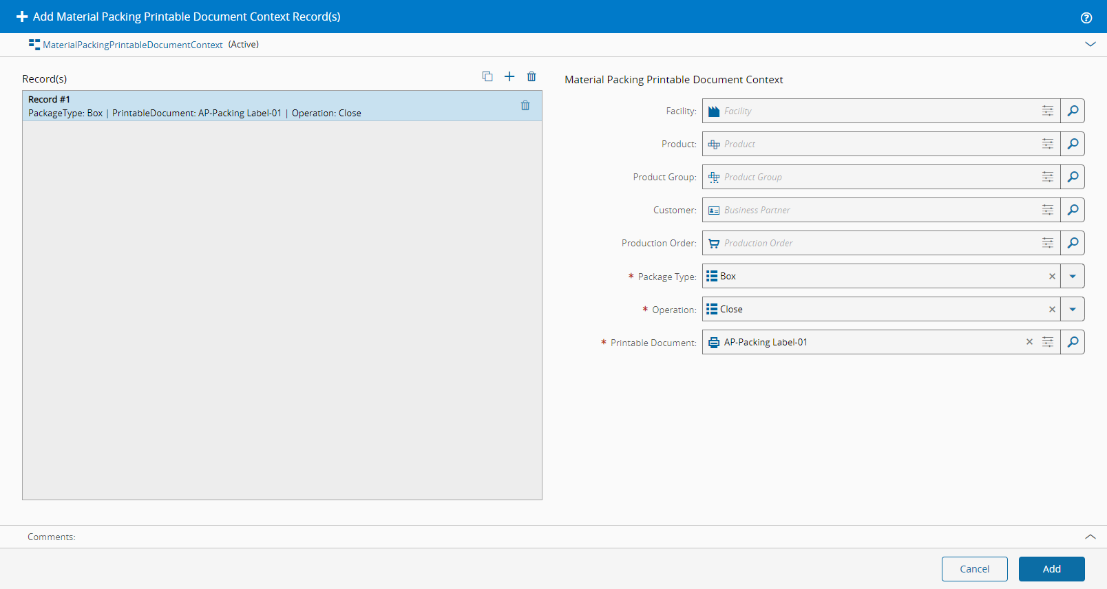 To automatically print the Package labels when opening or closing a package, you have to configure the MaterialPackingPrintableDocumentContext smart table. For each entry, you must define if the Printable Document is to be used with the Open or Close Operation.