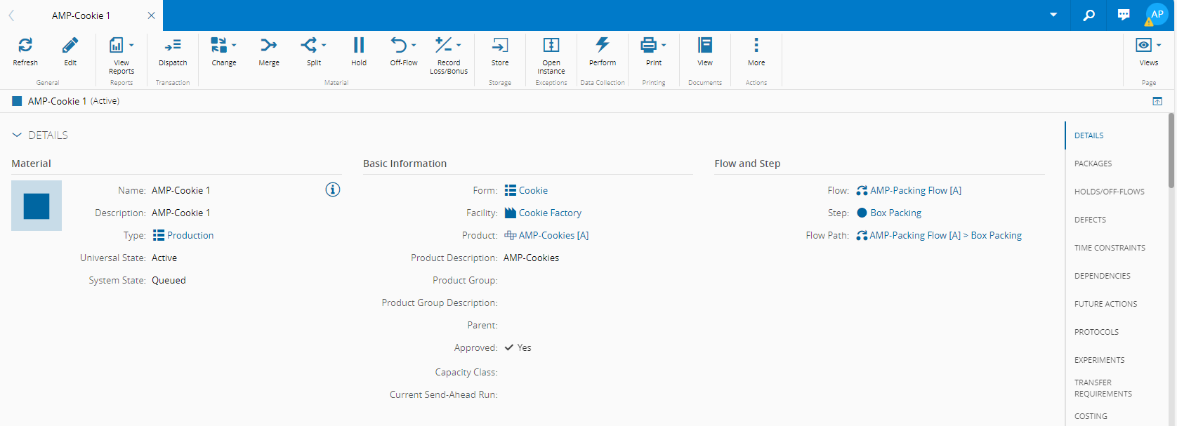 In the image above the cookie Material at Level 1 is already packed. This is, the Packed Quantity is 100%, and you can see its details by selecting the Packages section of this page.