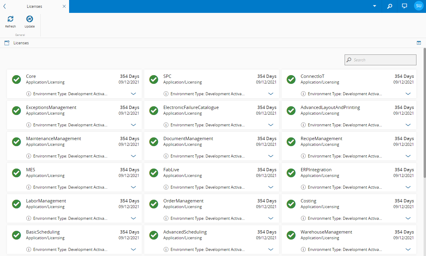 在“系统监控”页面中,您可以看到系统的现有许可证以及有关这些许可证的一些信息。在下面的示例中,凯睿德制造软件安装中有多个模块获得了许可,许可证的有效期截止日期均为每个条目中指定的日期。每个模块旁边均列出了以下信息: