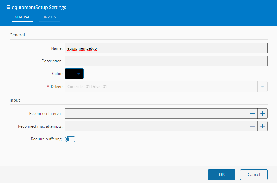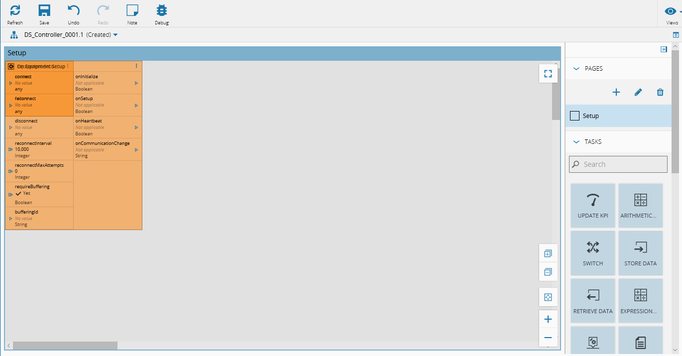 - 将onInitialize输出(1)连接到“OnEquipment设置”块的连接输入(2);这将导致驱动程序尝试连接到定义的设备。