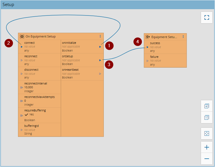 - 将“OnEquipment设置”的onSetup输出(3)连接到“设备设置结果”的成功输入;建立通信后,驱动程序将执行协议初始化所需的任何操作;这些操作取决于具体的协议,并且对于每个协议都是不同的。