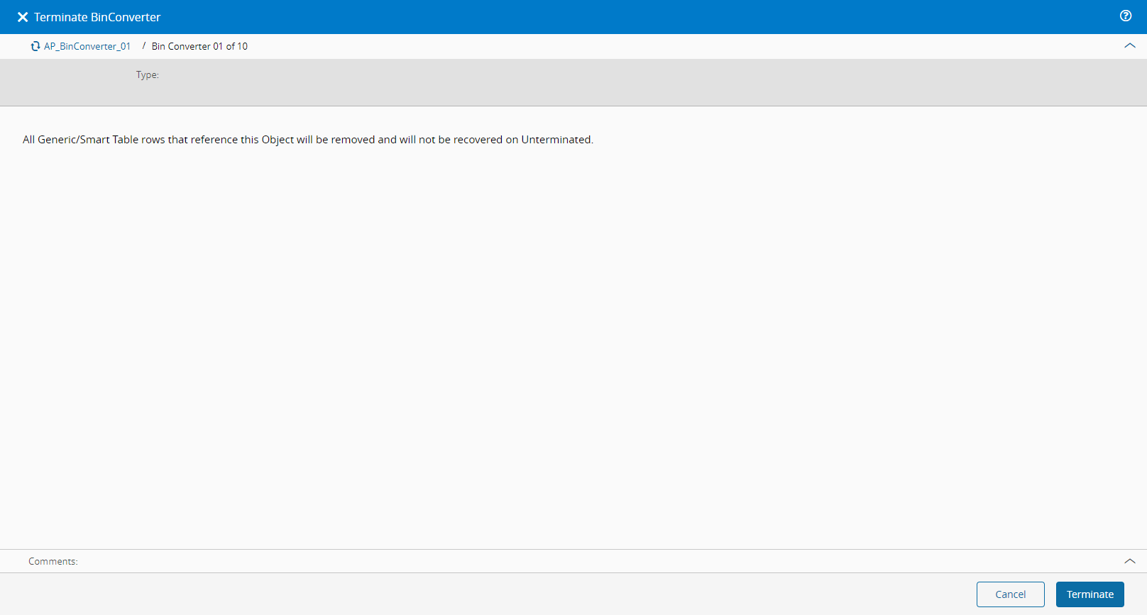 - 选择 终止使用 来执行操作。所有引用当前对象的通用/智能表行将被删除,并且如果稍后取消终止使用该对象,则不会恢复。