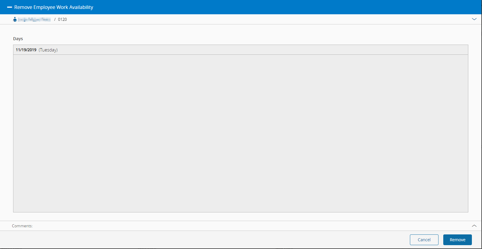 删除雇员的工时可用性# 概述# 删除雇员的工时可用性。 前提条件# 对于所选雇员日历天: 存在雇员日历天 IsAvailableToWork=true IsEmployeeWorkingDay=false(如果为true ,则表示已分配) 步骤顺序# 在日历中选择所需的雇员日历天,按删除下拉按钮中的删除工时可用性,然后执行以下步骤: 验证信息。 (可选)输入备注。 按删除按钮以完成事务。