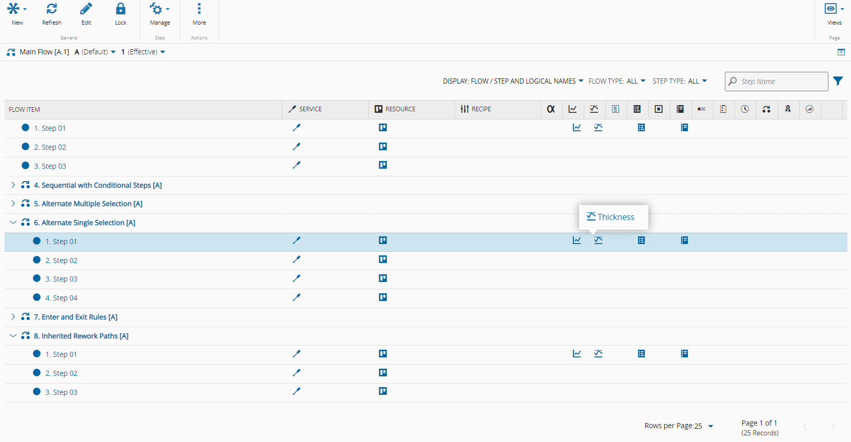 此视图显示以矩阵形式显示的上下文结构页面的相同信息,以便更轻松地鸟瞰与流程或属于流程一部分的步骤关联的整个实体集。