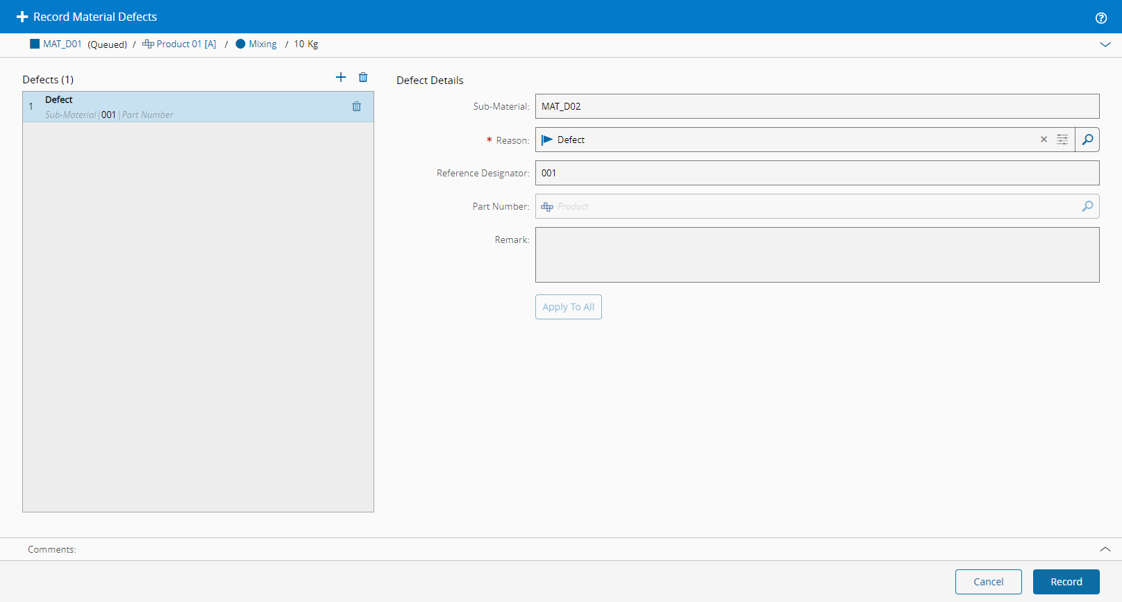 此操作用于记录指定材料的缺陷。