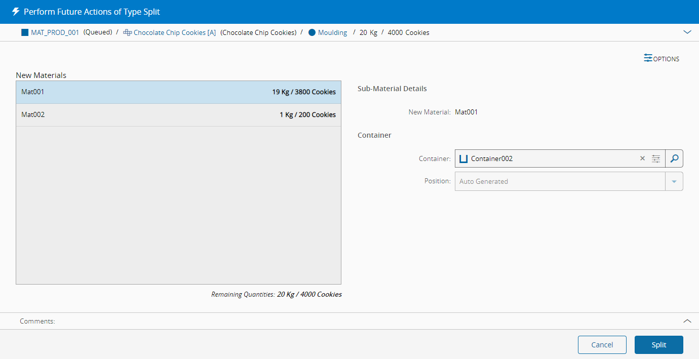 - 查看特定于要执行的预设锁定类型的预设锁定信息。大多数信息都是只读的,不能更改,因为这些信息应用作对用户的指示。如果是拆分类型的预设锁定,则用户可以更改子物料及其各自的子物料(如有)的容器分配。有关拆分向导的详细信息,请参阅拆分物料事务。