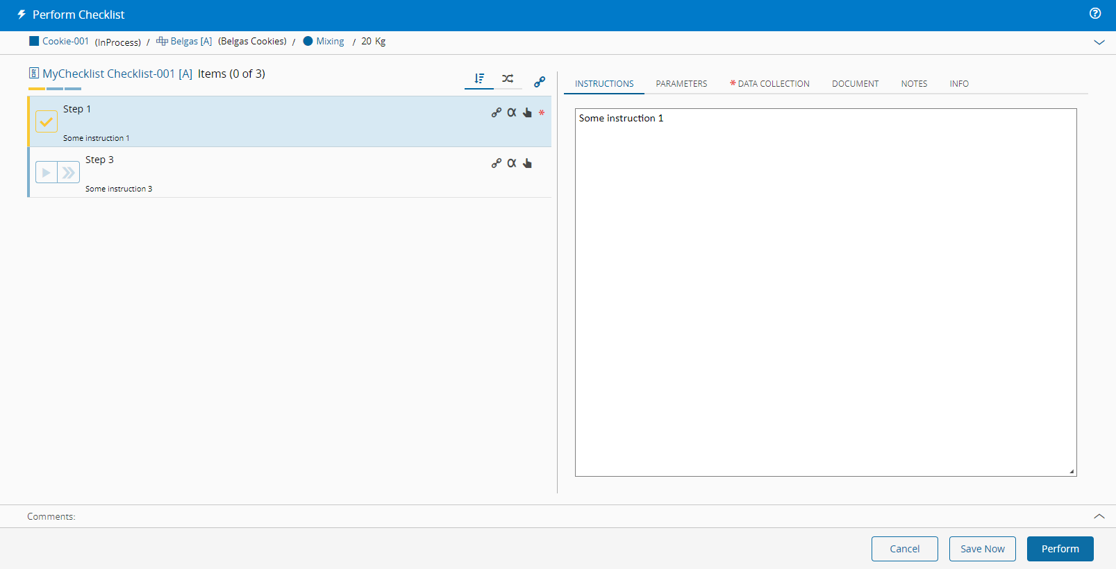 - 必须创建一个执行模式为长时间运行且范围为物料的检查清单,然后将其关联到使用步骤检查清单上下文的步骤。
