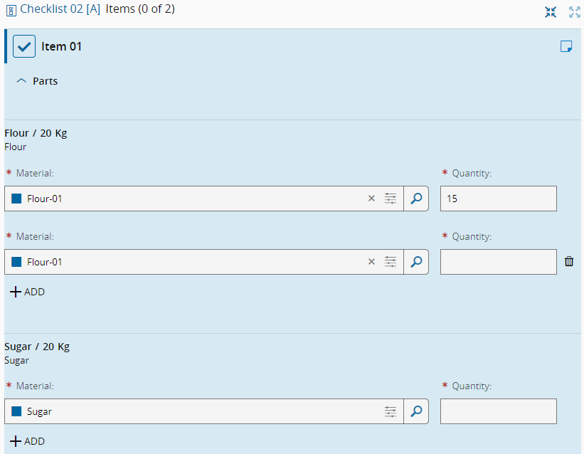 In terms of the BOM Products, the behavior is defined by the scope of the BOM associated with the Checklist. Also, more than one Material can be added to fulfill the required quantity. You can add new Materials by selecting ADD button and remove them by selecting the button after each Material. All Materials must be valid and meet the criteria for assembly as stated in Assemble Material.
