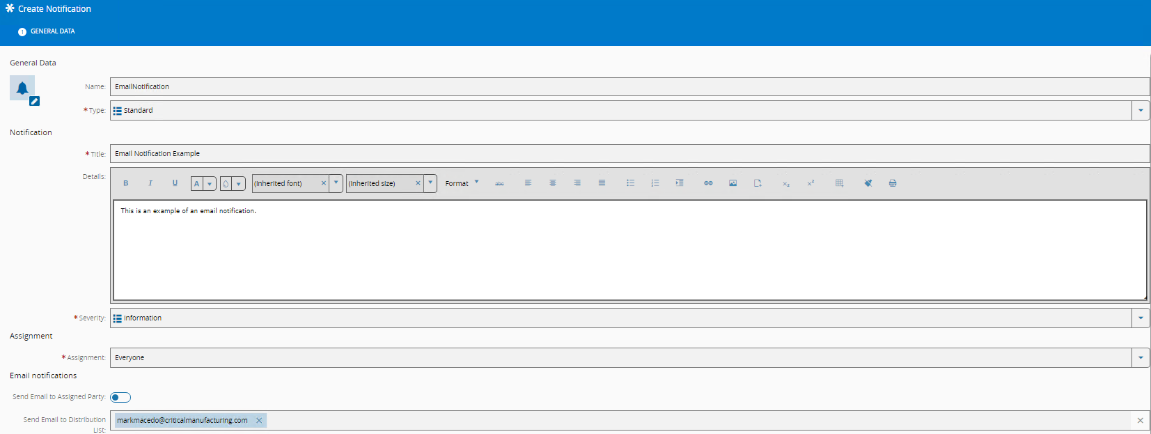 - 选择通知的严重性。严重性取自查找表NotificationSeverity。通用表NotificationSeverity配置不同通知严重性的行为,定义通知的颜色和显示模式。