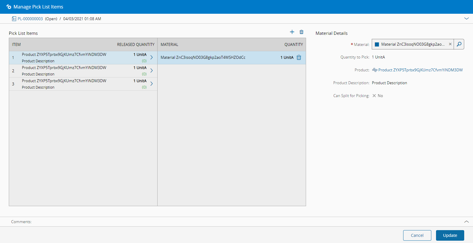 2. 为每个列出的提货单项目定义的物料可以替换为另一个物料,前提是释放数量尚未完成。允许添加或删除物料,数量将自动计算并显示。