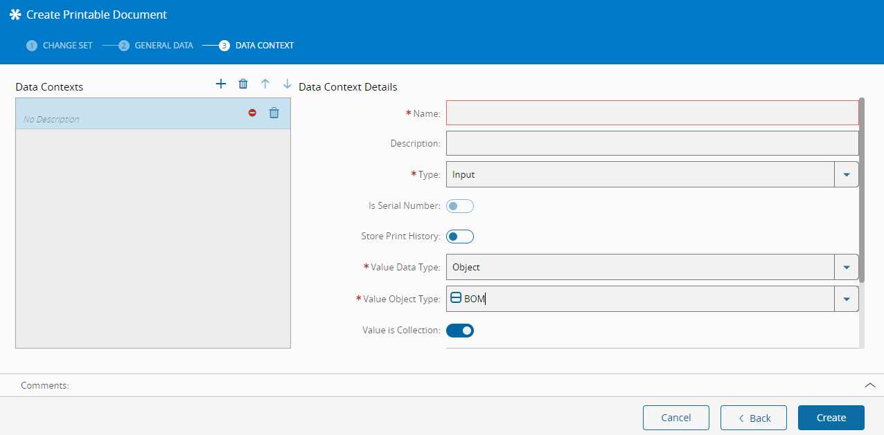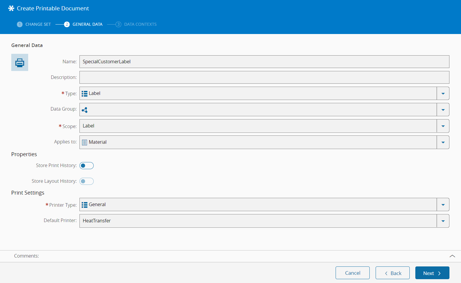 此步骤用于定义提供给可打印文档的上下文。对于批次流转卡类型,上下文是预定义的(尽管它只在向导关闭后才显示)且不能更改。