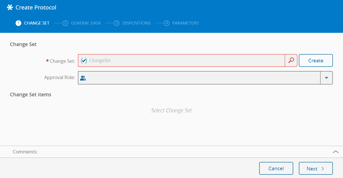 1.在业务数据中,选择异常流程,然后单击新建。 2.在变更集字段中,选择您预先配置的现有变更集。此步骤用于定义变更集配置。如果需要有关如何配置变更集的详细信息,请访问变更集部分。 3.视情况选择审批角色,然后单击下一步。