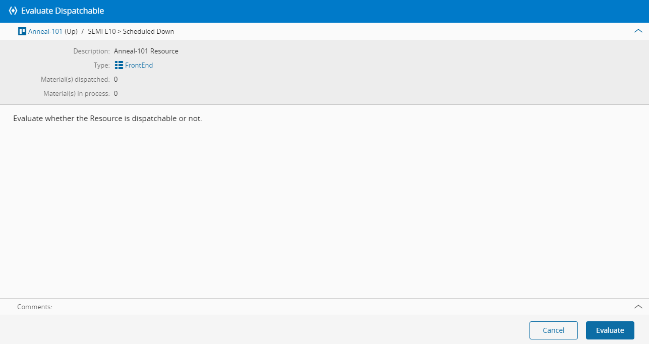 评估派工规则# Resource.EvaluateDispatchableRule 概述# 此操作用于评估规则以确定资源是否可派工。 设置# 执行此操作不需要特殊设置。 前提条件# 没有执行此操作的特定设置。 步骤顺序# 步骤1# 按评估派工规则按钮。 验证信息。 (可选)输入备注。 按评估完成事务。