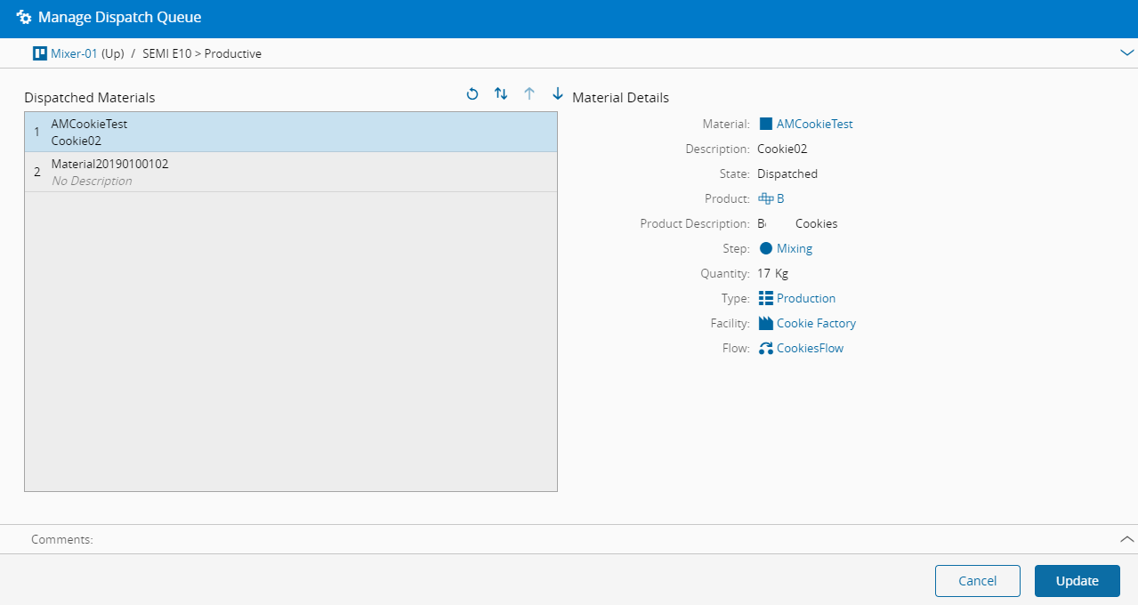 管理派工队列# Resource.ManageDispatchQueue 概述# 此操作用于管理资源的队列,即物料处理工单。 设置# 除了满足事务前提条件外,不需要任何特定设置。 前提条件# 资源在系统中处于活动状态。 步骤顺序# 步骤1# 向导打开后,按网格工具栏右上角的方向箭头可选择物料的位置。或者,也可以按照所需的顺序拖放物料。 如果您希望恢复物料的顺序,请按撤消按钮重置排序。 验证界面右侧显示的物料信息。 (可选)输入备注。 按更新完成操作。