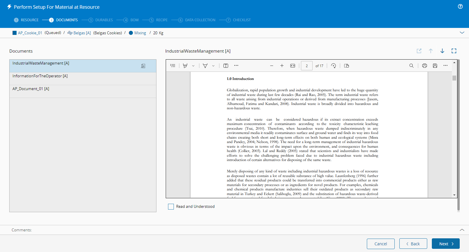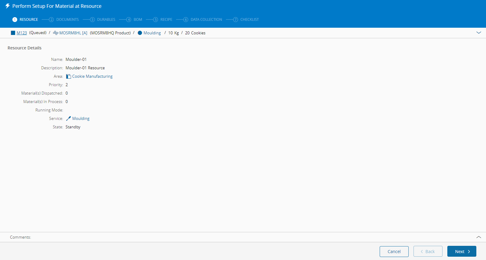 此步骤提供有关所选物料和资源的基本信息。
