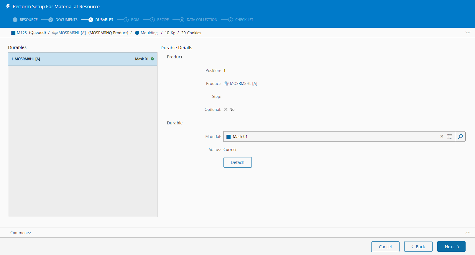 此步骤提供有关当前现有耐用品的信息,并允许用户添加和删除耐用品。 该步骤处的物料所需的耐用品显示在向导的耐用品步骤中。 可为资源添加和删除耐用品。