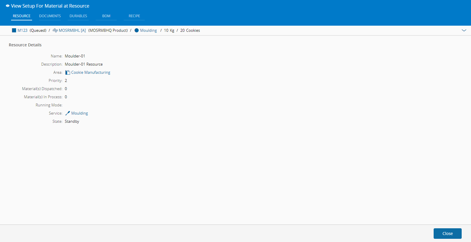 - 所选物料必须存在且处于活动状态,已在适用的资源上排队或派工,且必须位于最上方。