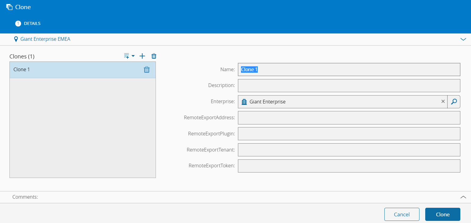 可以从“业务数据组”内的场所页面调用“克隆场所”向导。默认值将从当前场所中获取,用作新对象的基础值。