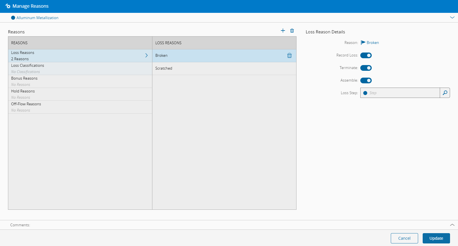 - 耗损原因可能有资格应用记录耗损、终止使用和装配;根据您的偏好设置为true或false。此外,出于报告目的,可以指定不同步骤来计算耗损。