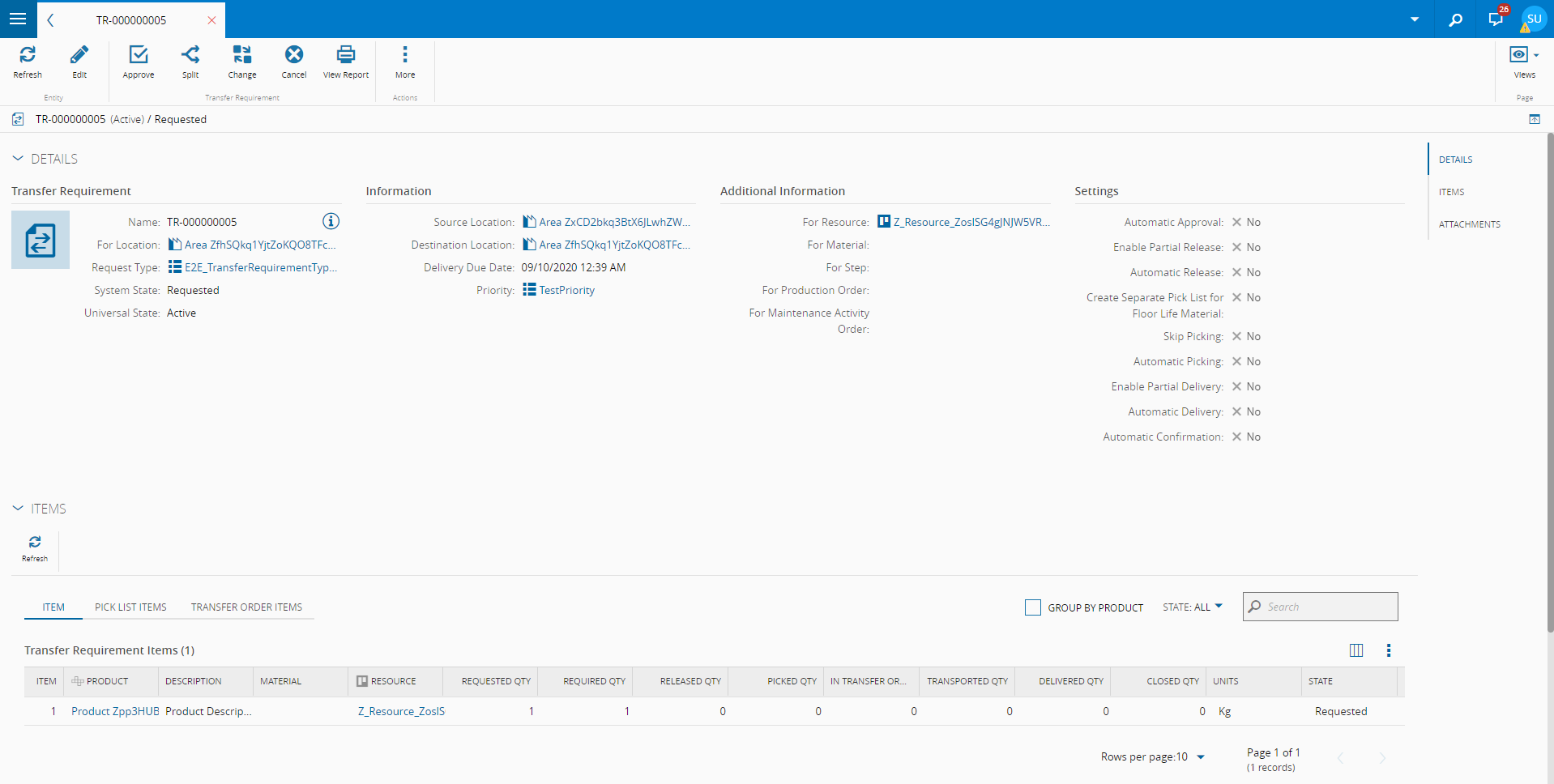 转运需求页面显示有关特定转运需求的一般信息。此外,它还允许用户执行可在特定转运需求上执行的所有操作。