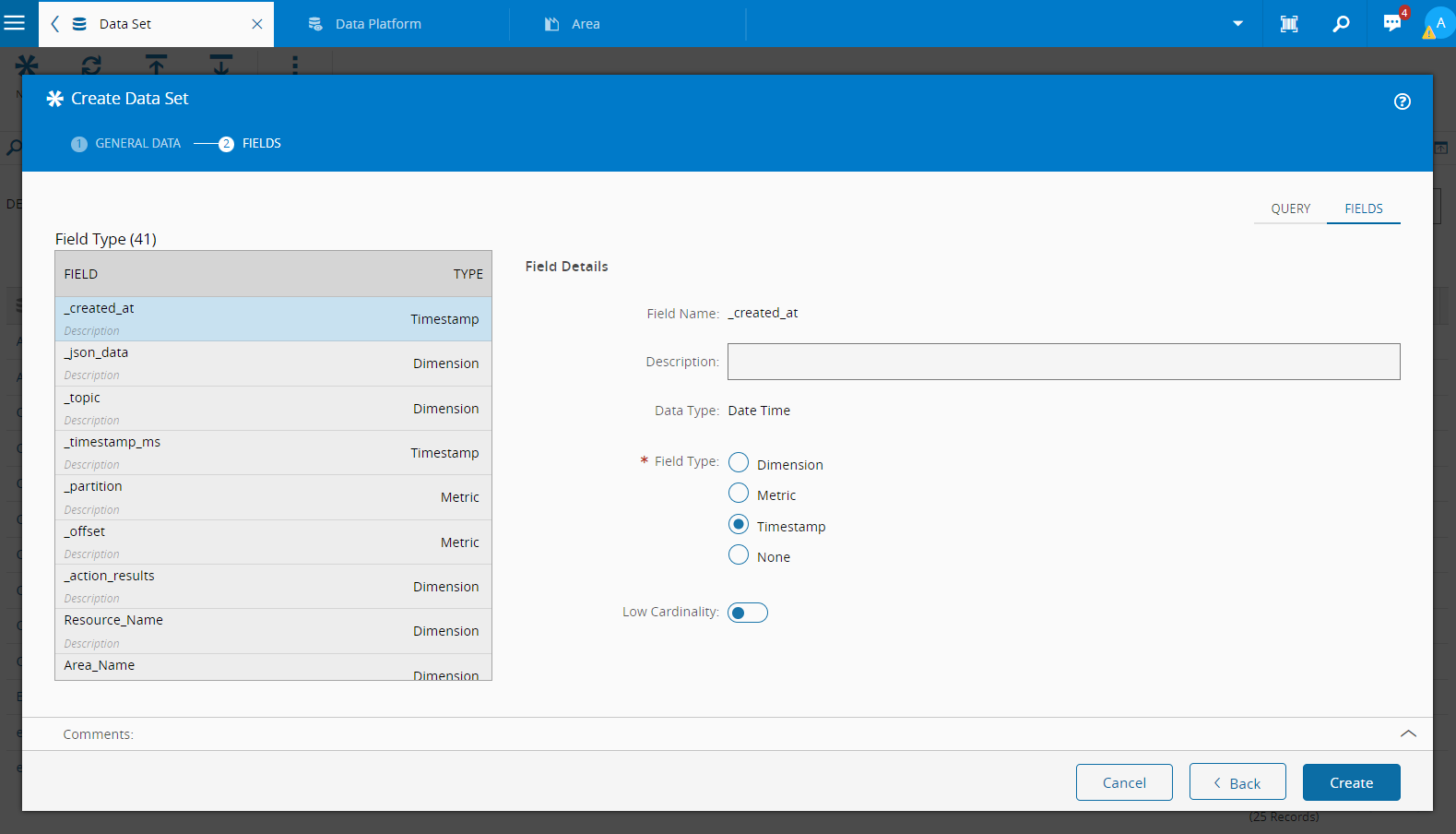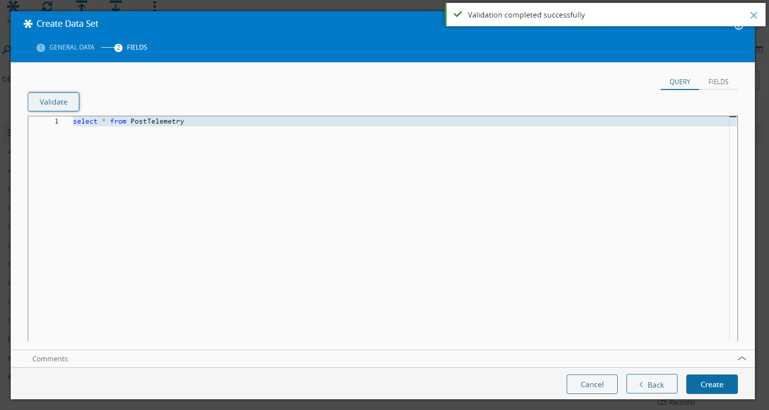 In Fields stage, the user may identify two tabs called Query and Fields. It is important to mention that the Data Set created this way, without a direct link to an IoT Event Definition, is of type Query, meaning it behaves as a materialized view,