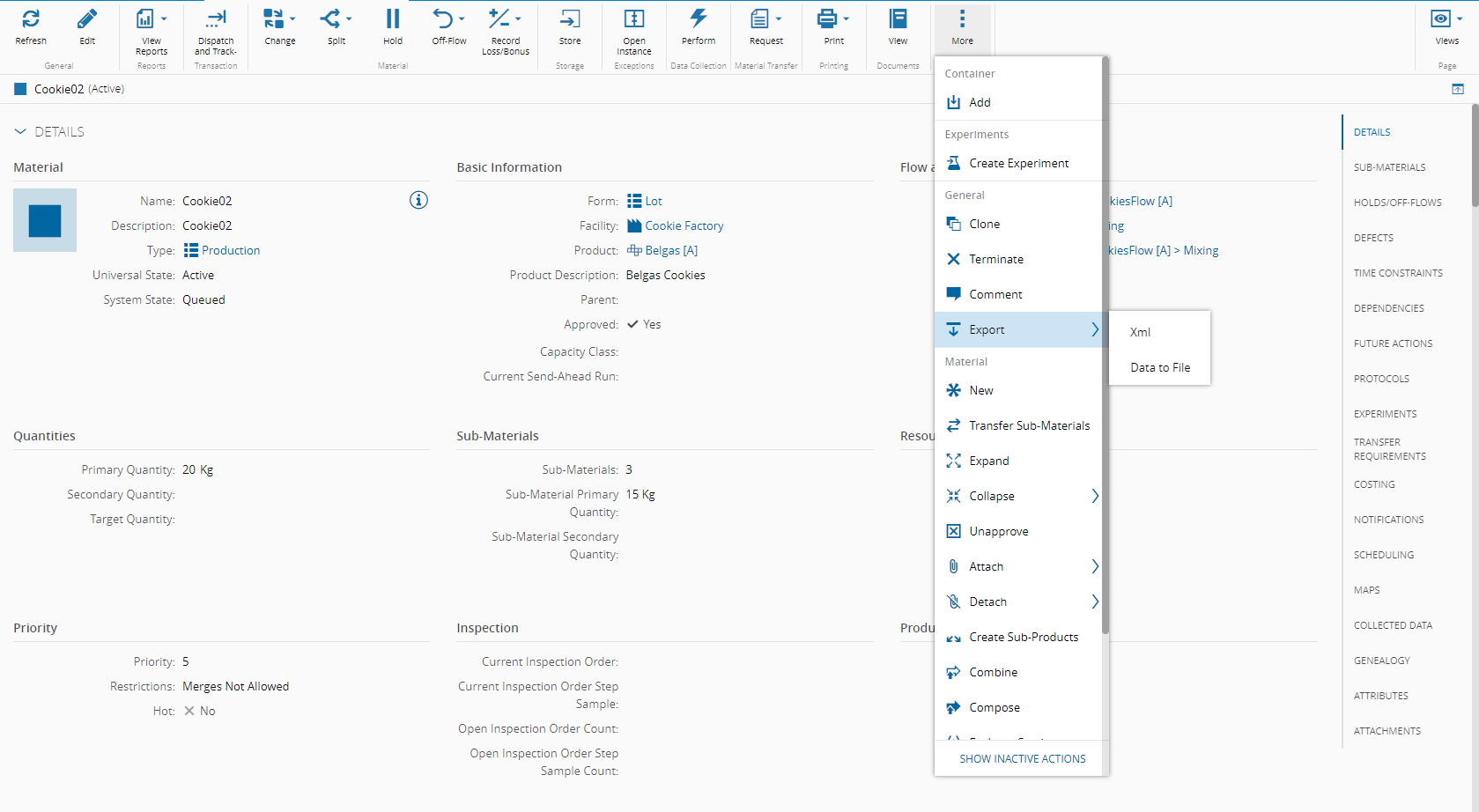 Critical Manufacturing MES提供了大量主数据导出的功能,您可以从整个系统导出数据以进行备份或离线分析或迁移。但是,您也可以通过选择实体详细信息页面顶部的导出,从单个实体导出数据。
