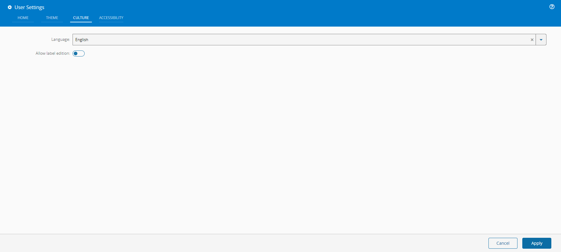 Select Save to complete the operation. To return to the default mode (without label editing), navigate back to the Culture tab on the User Settings dialog, set the Allow label edition switch to false and reload the system.