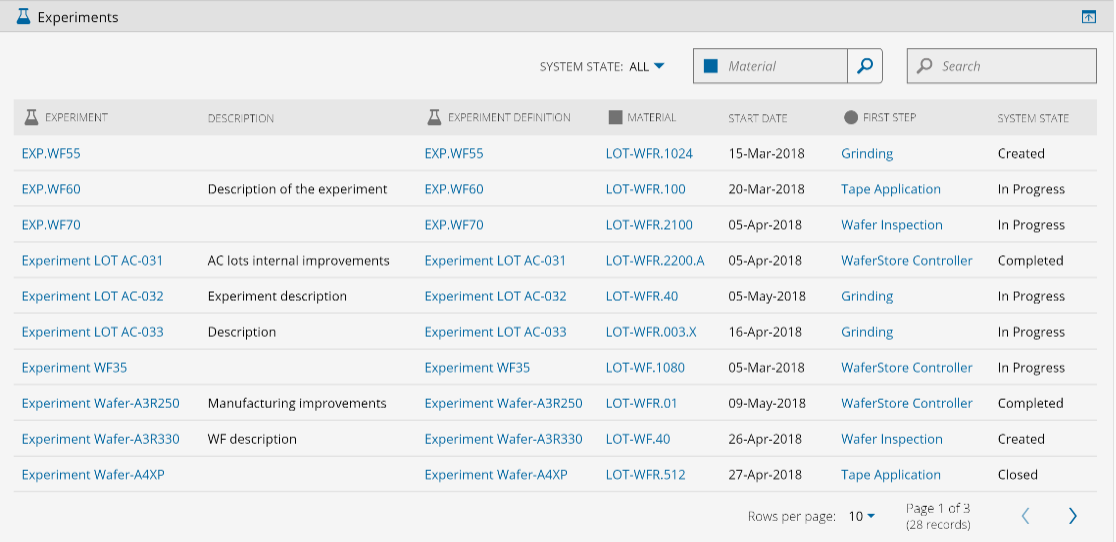 还可以按系统状态(创建、进行中、已完成和已关闭)筛选列表,并使用试验名称或物料信息搜索试验。