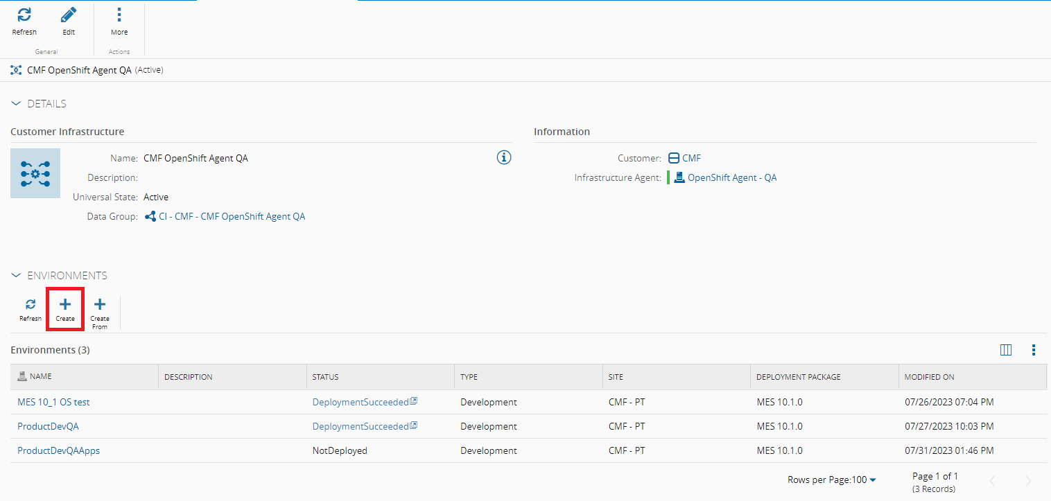 Load the Environments section in the main page of the Customer Infrastructure and select Create. This opens a transaction wizard.