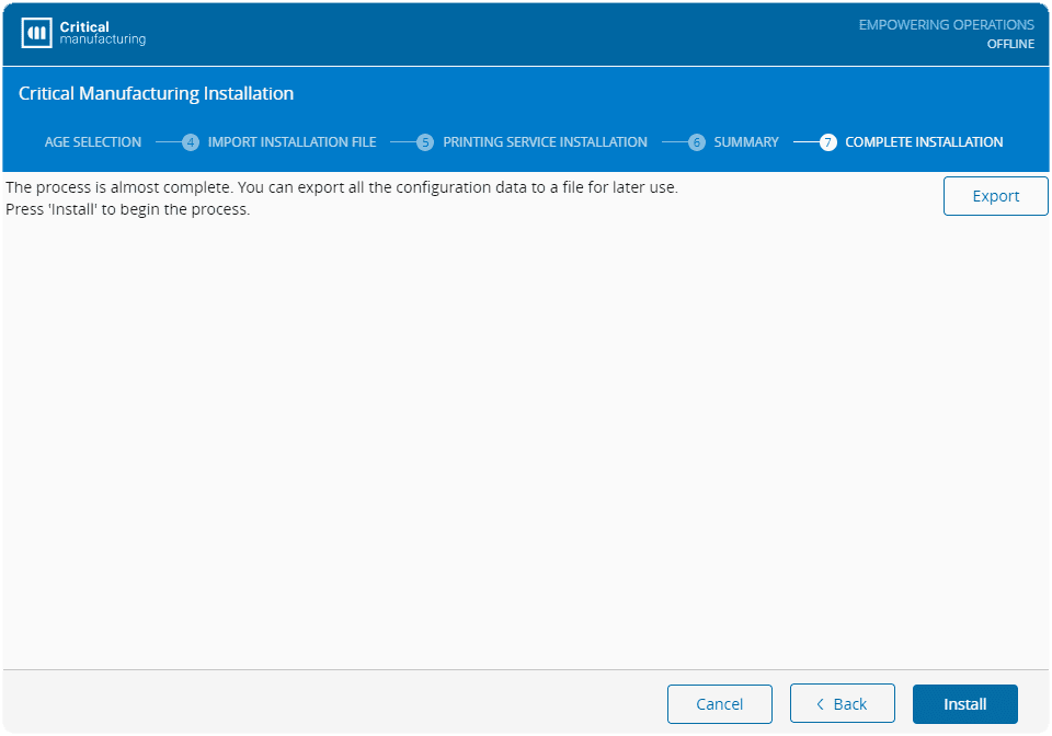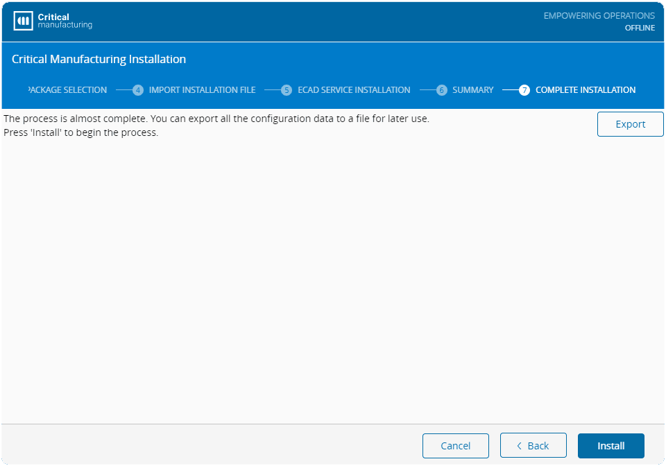 In the Complete Installation screen, you can export all the current installation configuration data (including licenses) to a file. To export the current configuration data, select Export and then choose a location and a file name.