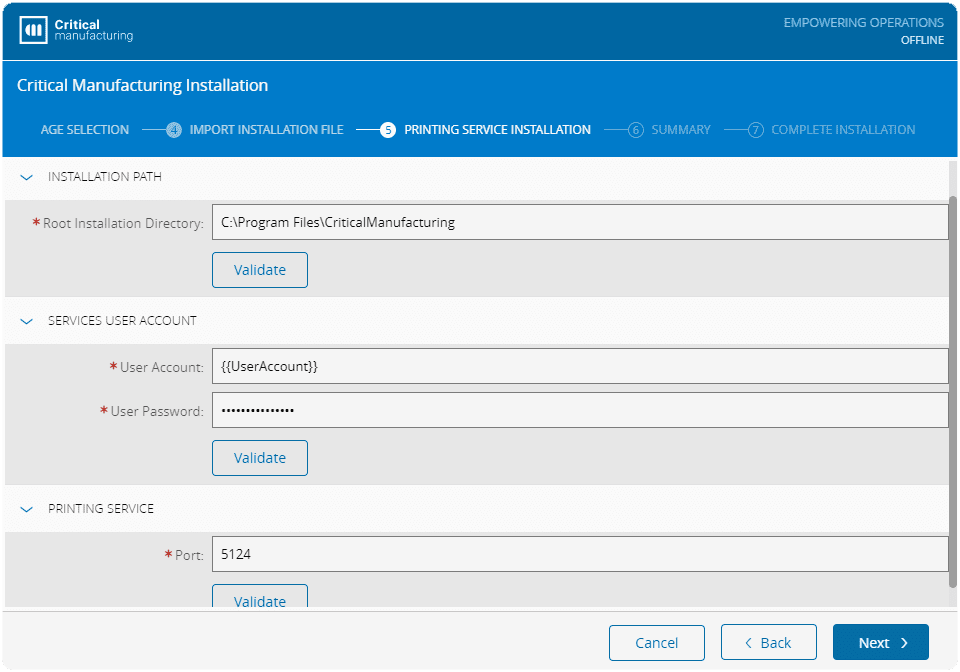 After selecting the Printing Service package, the user must fill (or import from a parameters file) the following information:
