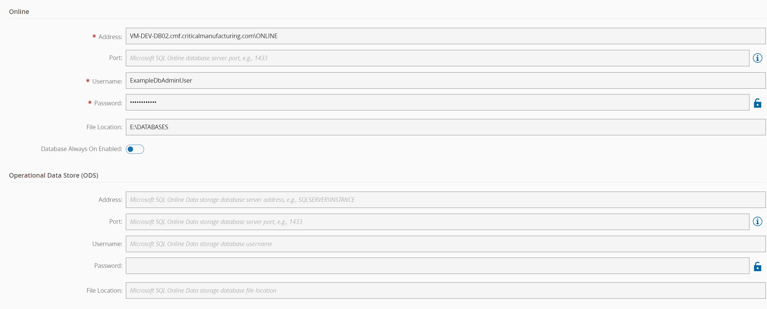 - Database Always On Enabled - whether to enabled Always On mode. Applies to Database Modes: None and MES Analytics. Feature not available with MSSQL Server database mode.