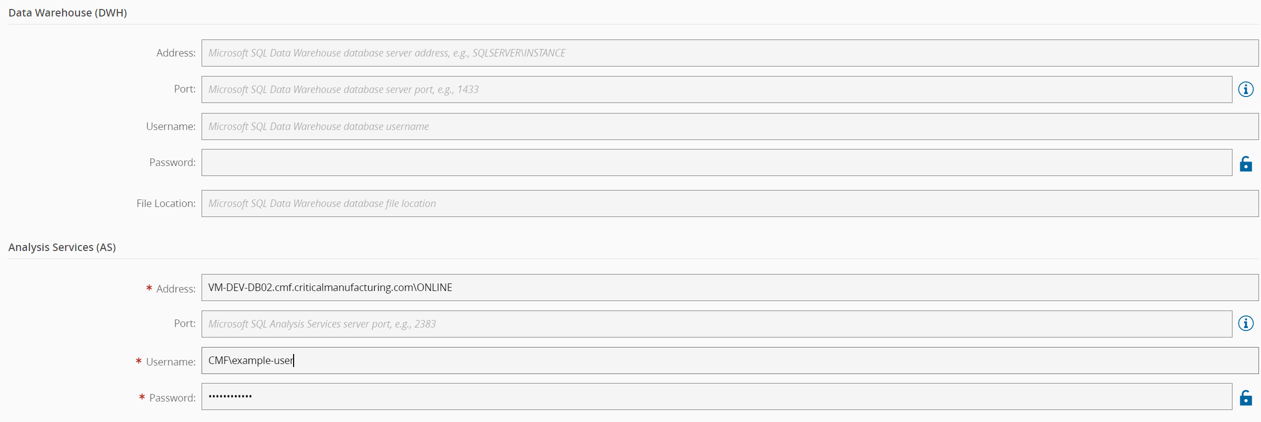 - Data WareHouse (DWH) - DWH database information. Applies to Database Modes: MES Analytics.
