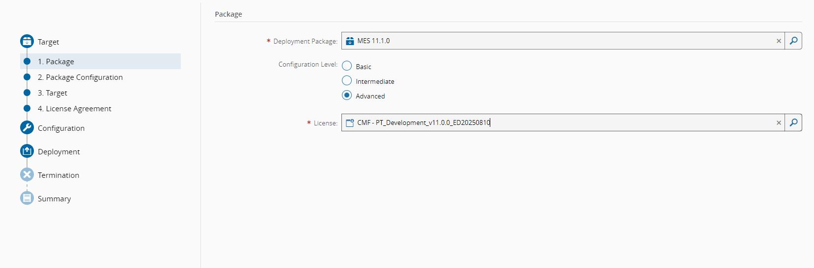 - Deployment Package - base package to be used. If you are installing a Critical Manufacturing MES 11.1.0, set the value to