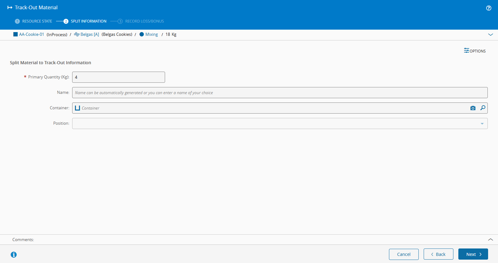 This means that when you tack out your Material you will be asked about the split information, or the amount you want to send forward. Additionally, in this wizard you can already see that the name can be automatically generated: