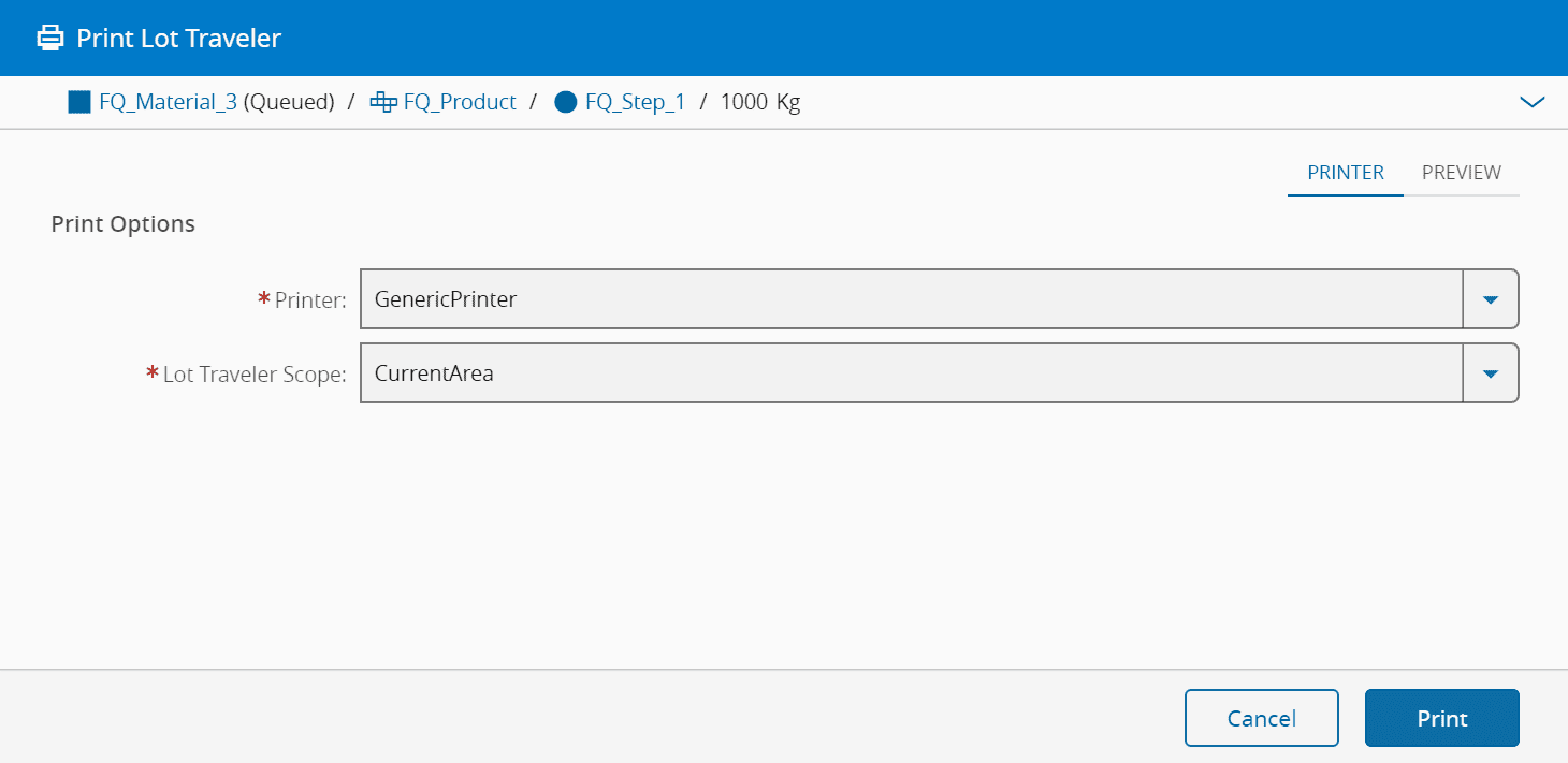 More information on how to print a Lot Traveler or other Material documents can be found at Print Material Documents section of the User Guide.