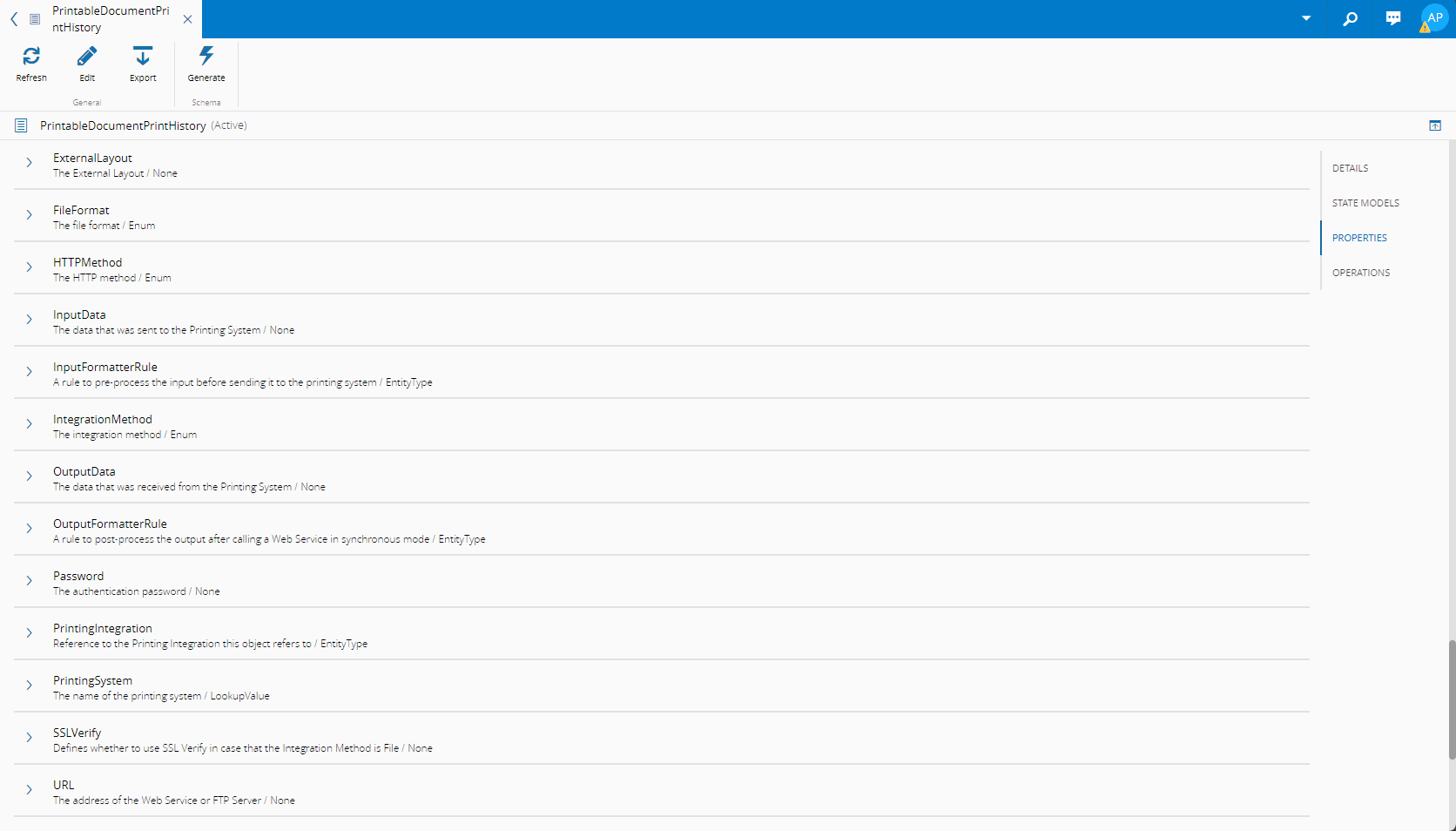 In the sections below, you can see the available options in the Printable Document and Printable Document Print History entity types.