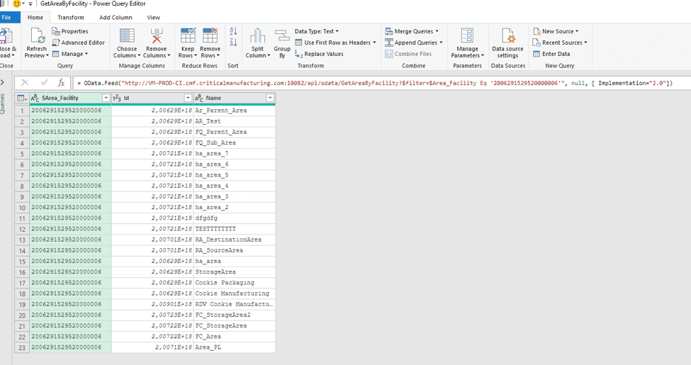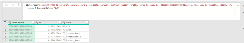 OData.Feed("<http://VM-PROD-CI.cmf.criticalmanufacturing.com:10082/api/odata/GetAreaByFacility>?$filter=$Area_Facility Eq '2006291529520000006'", null, [ Implementation="2.0"])