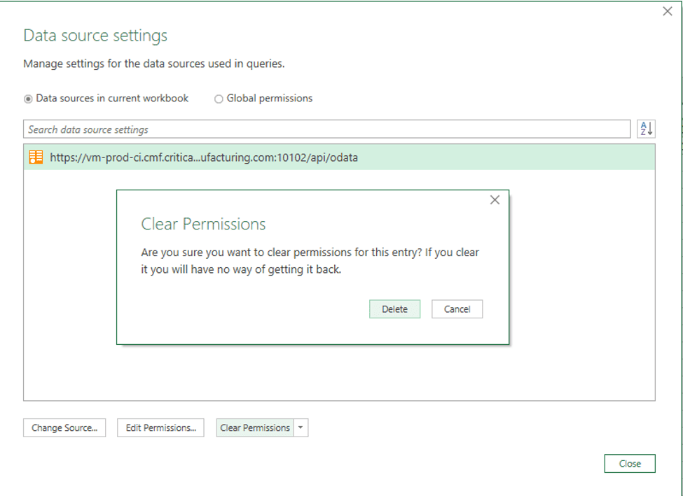 Use the Get Data functionality from the Data menu, as shown in the image above, and select the Data Source Settings option. In the following screen, select the endpoint causing the issue and select Clear permissions. Select Delete in the next dialog to confirm the operation and repeat the connection configuration:
