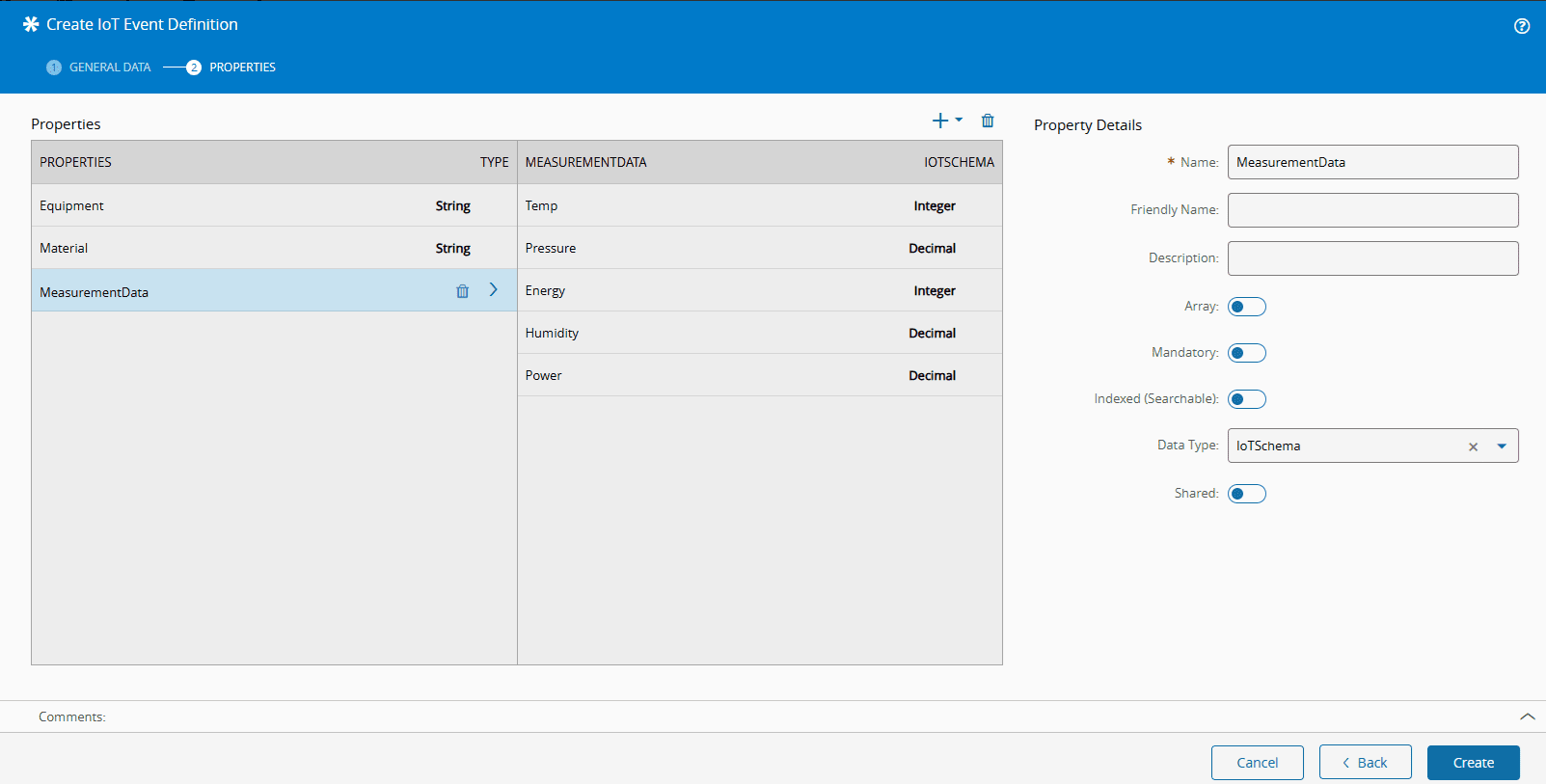 After creating the properties manually or importing from a JSON file, the IoT Event Definition can be created.