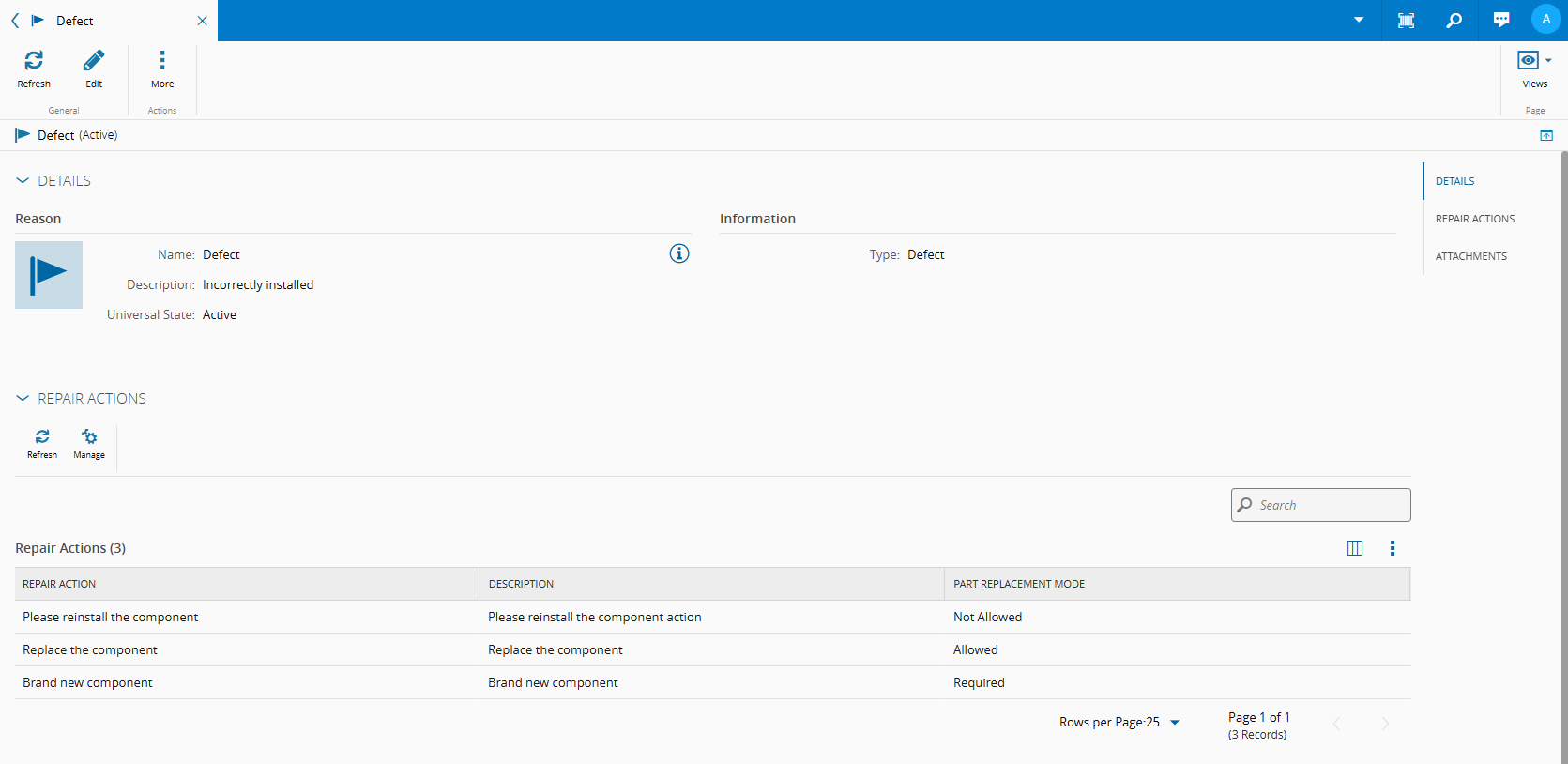 The Repair Actions available for selection are the ones defined in the Defect Reason of the defect.