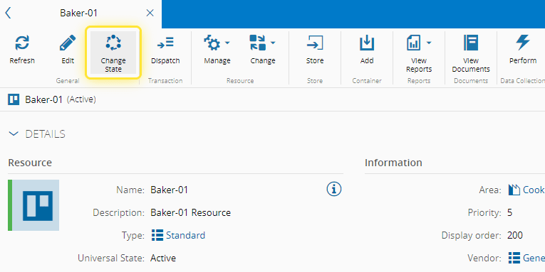 For more information, see Change Resource State - Critical Manufacturing Documentation Portal ⧉