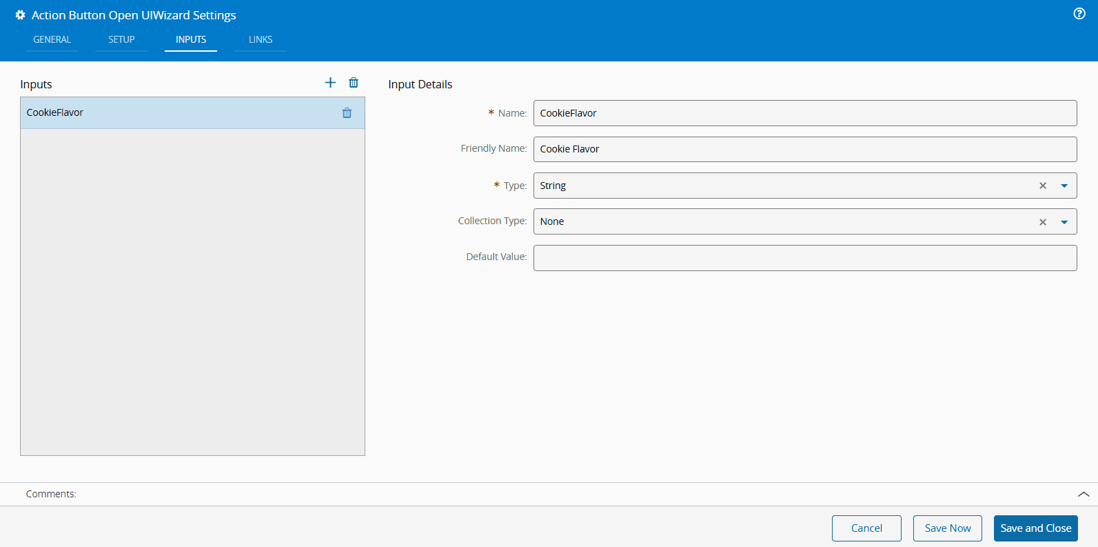 Optionally, define the Inputs. Note that some System Actions, such as Area, Material, or Maintenance System Actions, will have predefined inputs that cannot be modified. You may add additional inputs as needed.
