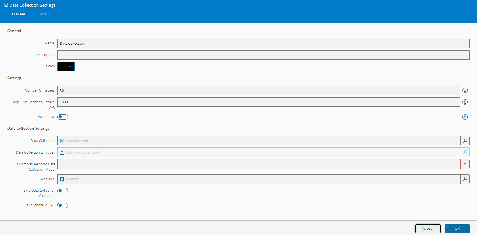 | Complex Perform Data Collection Mode | Enum | Perform to All Materials in Resource Perform to First Material in Resource Perform to MaterialPerform to Resource | Selected mode used to perform the DataCollection | |