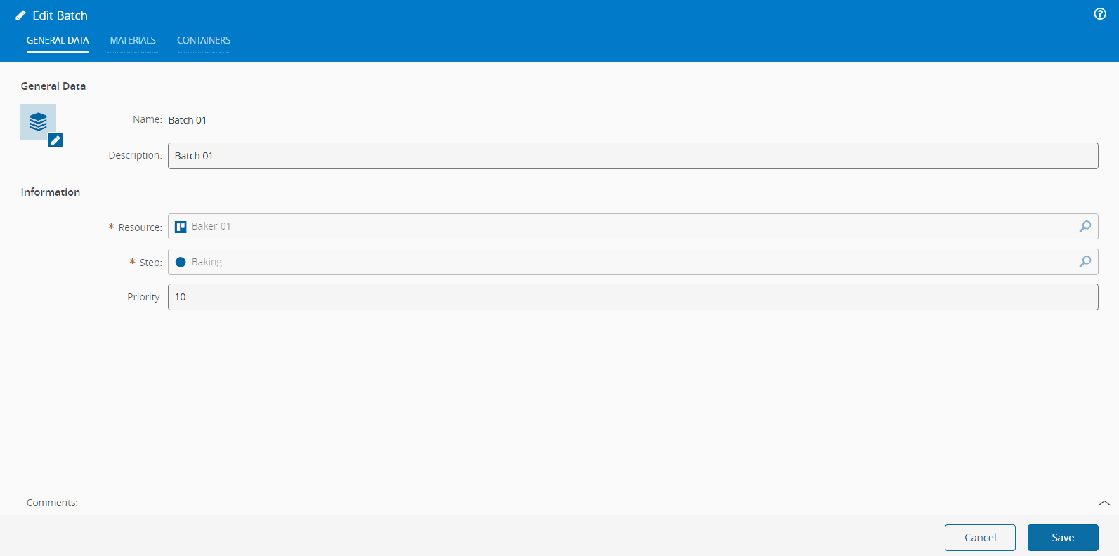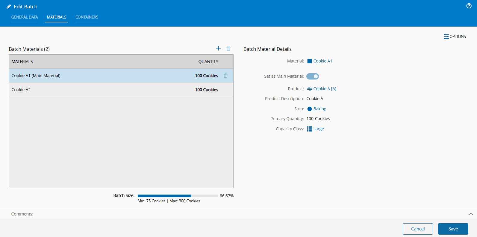 Additionally, if the Batch is not in Created state, you will not be able to modify the list of Materials, including Main Material,